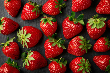 Top view of juicy strawberries carefully arranged on a dark slate, perfect for food and nutrition themes