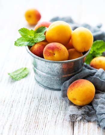 Fresh ripe apricots on wooden plate, mint leaves, fruits apricots on cutting board, cut apricots in half. Light white rustic wood background.