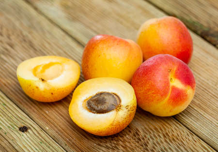 Fresh ripe apricot fruits with kernels isolated on wood background