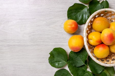 Wooden bowl with fresh organic apricots on the table. Top view.