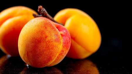 Vibrant Trio of Ripe Apricots on Black Background, Showcasing Soft Orange Tones and Smooth Skin