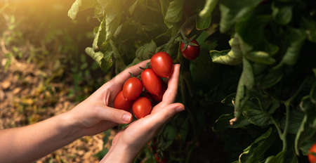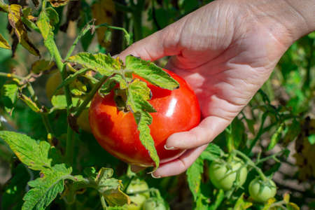 A womans hand picks a ripe red tomato, plucks it from the vine of a tomato plant. Close-up