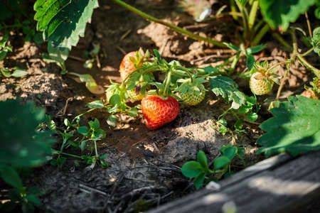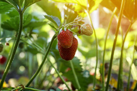 Close up on a garden strawberry bush with Ripe strawberry grows on a bush with unripe berries