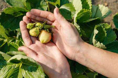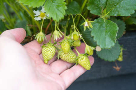 A bunch of ripening unripe green strawberries not torn from the bush lies on the palm.