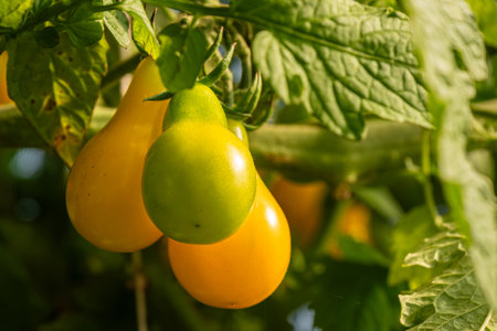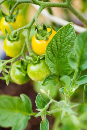 Fresh organic yellow tomatoes. Organic non-GMO yellow tomatoes on a bush. The concept of health, non-GMO products, clean ecological food.