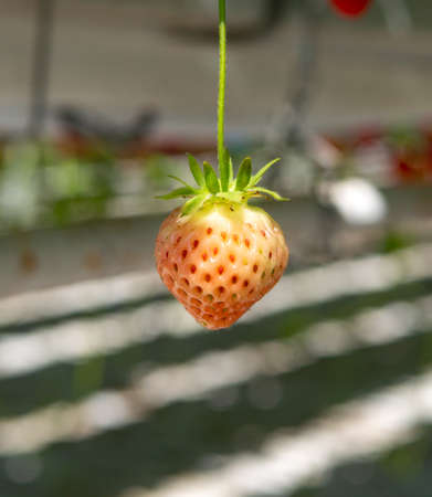 Strawberries in the strawberry field have green leaves and white or red fruits