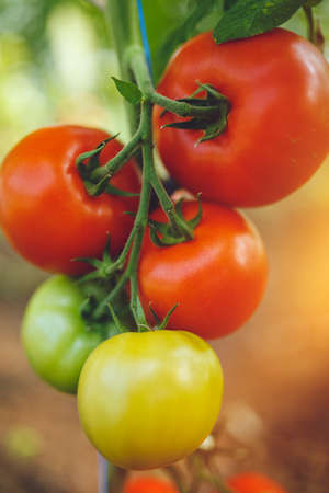 Natural tomato greenhouse. Beautiful red ripe and green tomatoes grown in a greenhouse