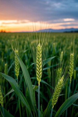 Fresh green stems of spring wheat rise in the field as warm sunlight fills the sky, marking the start of a new growing season.