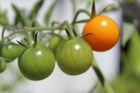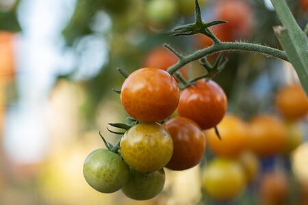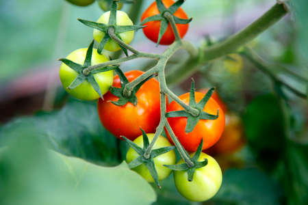 Red and green cherry tomatoes on a branch in the garden, stock photo