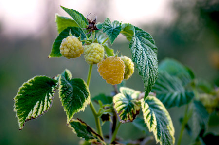 A berry branch of a raspberry bush in the garden with yellow raspberry berries