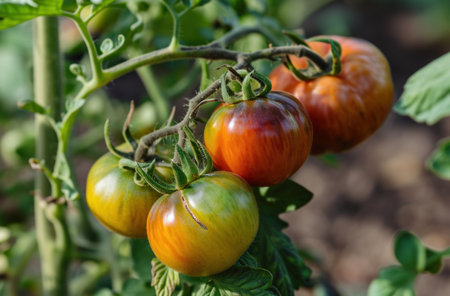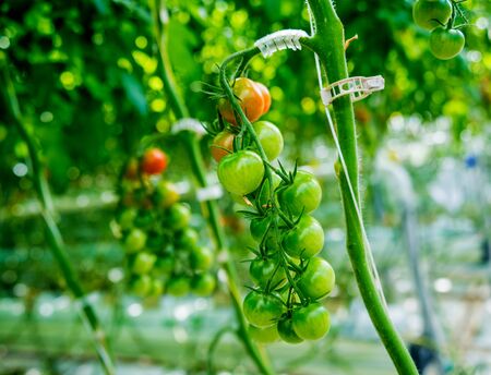 Beautiful tomato plant on the branch in greenhouse in foreground, copy space , organic tomatoes