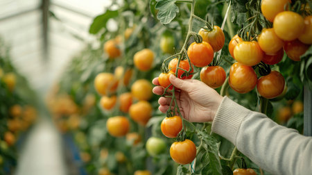 A hand carefully picks ripe tomatoes in a lush greenhouse, showcasing vibrant colors and healthy plants, emphasizing the beauty of sustainable agriculture.