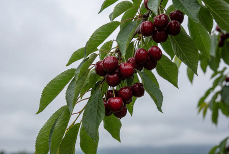 Clusters of ripe, dark red cherries hanging from a cherry tree branch, showcasing their readiness for picking during the vibrant harvest season. Fresh, juicy fruit glistening in the summer sun.