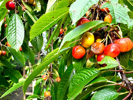 On a branch of a tree in the garden hang rotten cherry fruits, damaged and eaten by birds, together with ripe whole good fruits. disease of fruit trees. Rapid spoilage and rotting