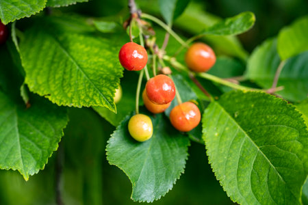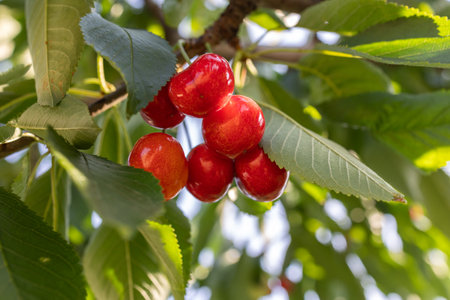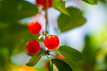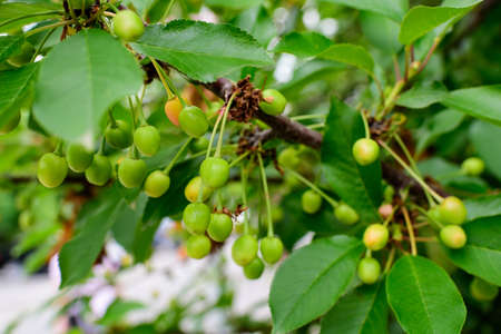 Close up of a small branch with fresh raw unripe organic sour cherries and green leaves in a tree in an orchard in a sunny summer day, beautiful outdoor natural background, urban gardening
