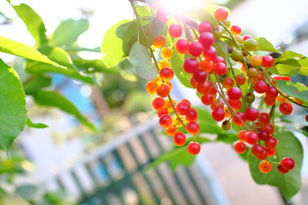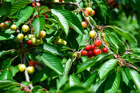 Organic sweet cherry ripening on cherry tree close up, sunny day