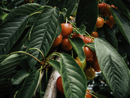 Fresh and sweet cherries ripening in the cherry tree