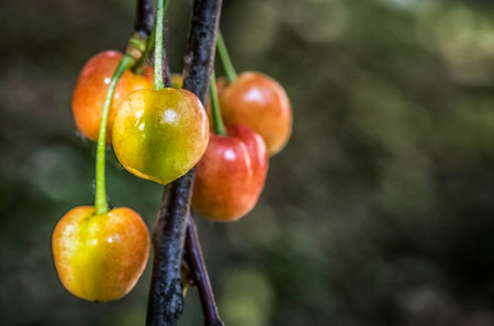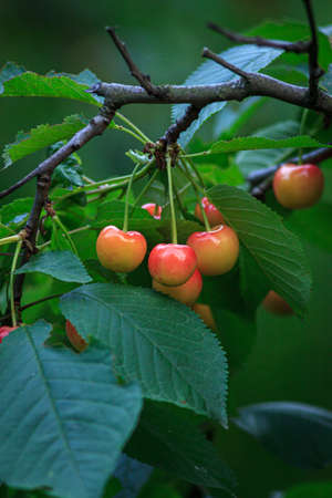 Ripening cherry fruits hanging on a cherry tree branch. Harvesting berries in cherry orchard on sunny summer rain.
