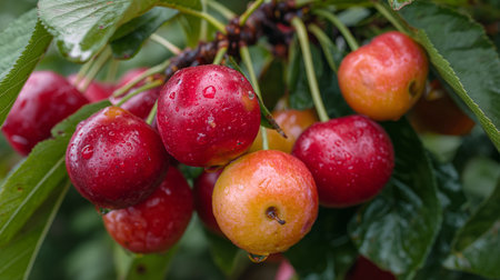 Juicy cherries hang from a green branch, adorned with fresh raindrops. The rich colors and lush foliage create a vibrant backdrop in the orchard during spring.