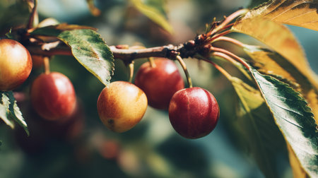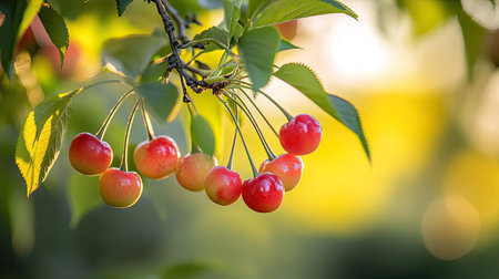 A beautiful cluster of fresh cherry berries hangs from a tree branch, capturing the essence of summer with vibrant colors and warm sunlight filtering through lush leaves.