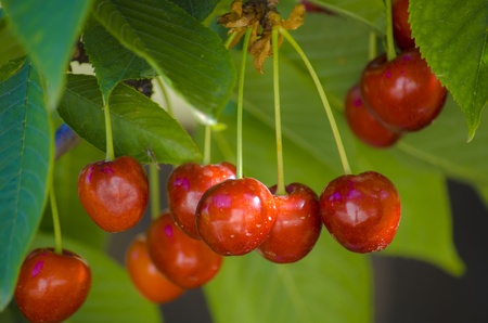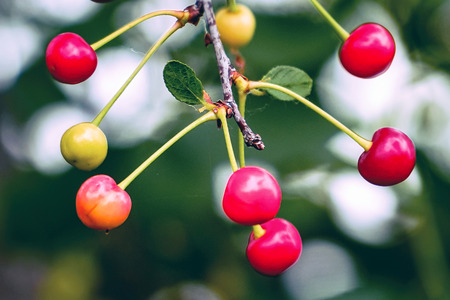 Red and sweet cherries on a branch just before harvest in early summer.
