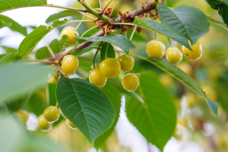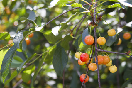cherry or sweet cherry growing on the tree on the farm in summer