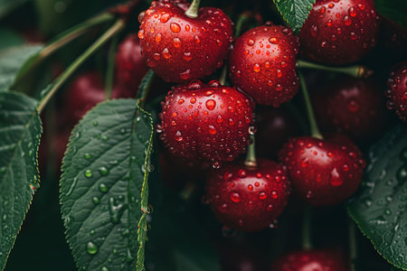 Ripe cherries glistening with dewdrops on a sunny morning
