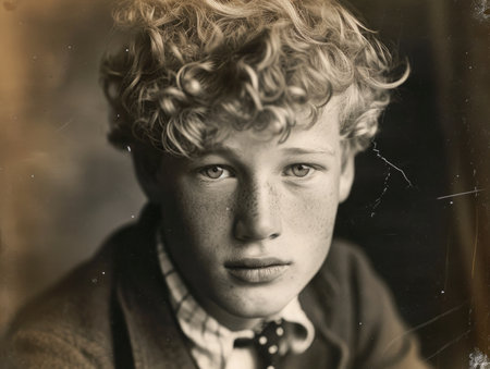 Photorealistic Teen White Man with Blond Curly Hair vintage Illustration.