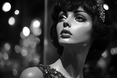 Black and white photo of a female mannequin wearing an elegant dress and posing in a shop window