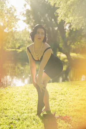 Portrait of old-fashioned red haired woman dressed in style of Great Gatsby era shows her legs and adjusts nylon mesh stockings. Vintage, flapper party, retro fashion concept