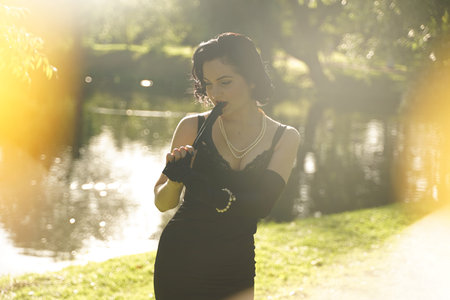 Beautiful young woman with pin-up make-up and hairstyle posing in the summer city park