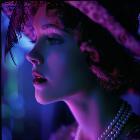 Soft profile of a woman in 1920s attire, adorned with feathers and pearls, set against a moody jazz club backdrop featuring rich blues and purples.