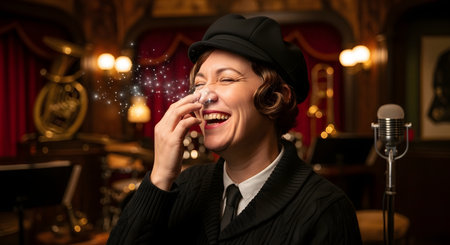 A woman in vintage 1920s-style clothing laughs with pure joy in a dimly lit club setting with a classic microphone. A whimsical trail of magic sparkles emanates from her nose, suggesting a delightful scent or a magical moment of happiness.