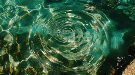 A serene turquoise water surface gentle concentric ripples emanating from a single drop, with sunlight creating shimmering patterns beneath the...