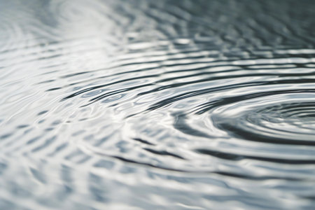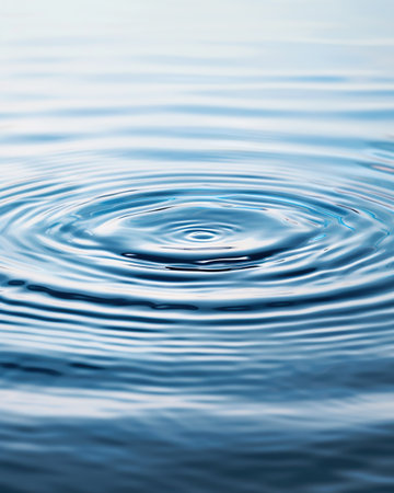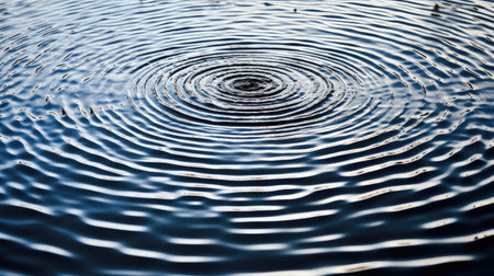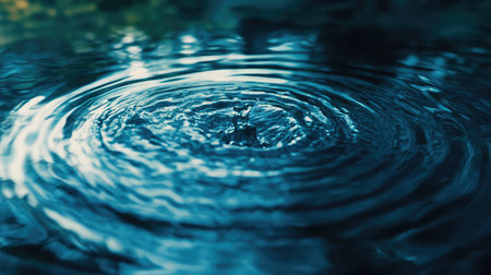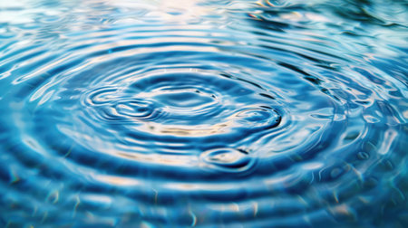 Concentric ripples expanding outwards from the point of impact of a single water droplet, creating a mesmerizing pattern on a calm, blue water surface, evoking tranquility and mindfulness