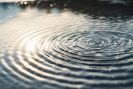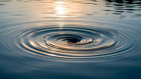 Detailed view of water's surface during golden hour, where concentric ripples gently expand. Warm sunset light paints the water, evoking peace and reflection.