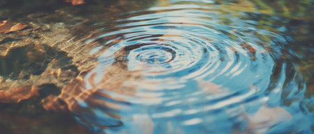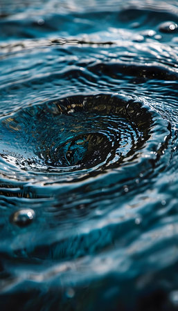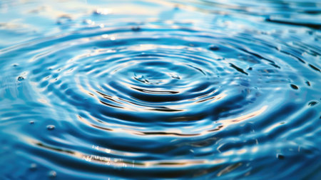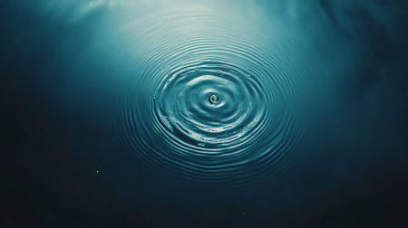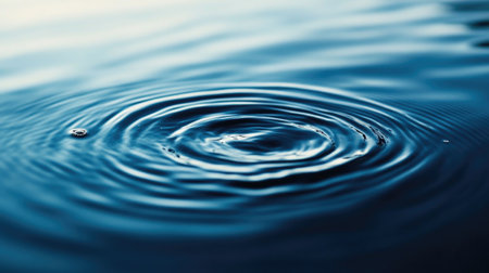Concentric ripples expanding outwards from the point of impact of a single water droplet, creating a mesmerizing pattern on a calm, blue water surface, evoking tranquility and mindfulness