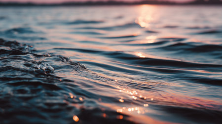 A serene view of gentle waves at sunset, showcasing shimmering reflections and soft ripples across the water surface, evoking a sense of tranquility and peace.
