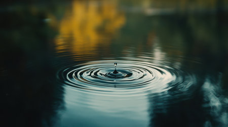 A water droplet falls into the surface of still water, creating a perfect ripple effect, symbolizing simplicity and calm.