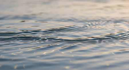 This image captures the serene beauty of gentle ripples on the surface of a body of water, likely a lake or ocean, during sunset. The soft, golden light reflects off the water, creating a warm and peaceful ambiance. The ripples, caused by a gentle breeze or a subtle disturbance, add a sense of movement and life to the otherwise calm scene.