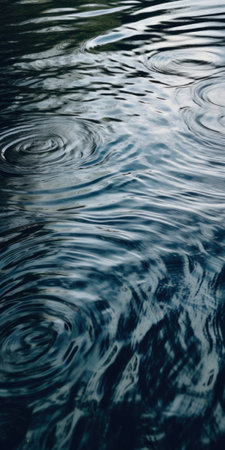 Rain drops causing circular ripples on the surface of blue water, evoking a peaceful, calming atmosphere ideal for tranquil nature photo shoots
