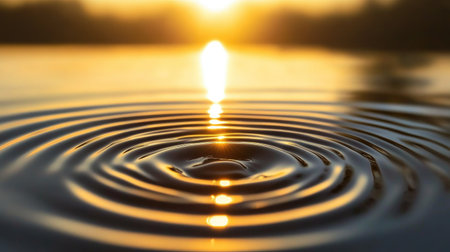 Detailed view of water's surface during golden hour, where concentric ripples gently expand. Warm sunset light paints the water, evoking peace and reflection.