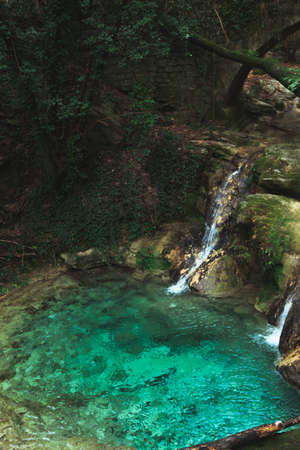 Trekking excursion in the cold and crystalline waters of the Ghiaccioni waterfall, Chianni in the municipality of Castellina Marittima, Pisa, Tuscany