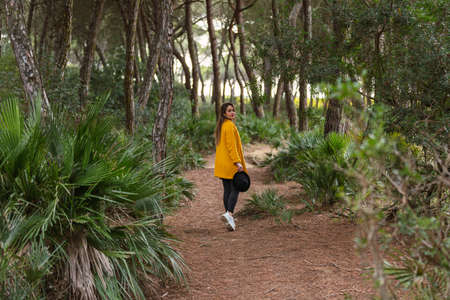 Back view of elegant young woman in yellow casual coat in the forest. Cute model walks in the park in spring against background of nature.