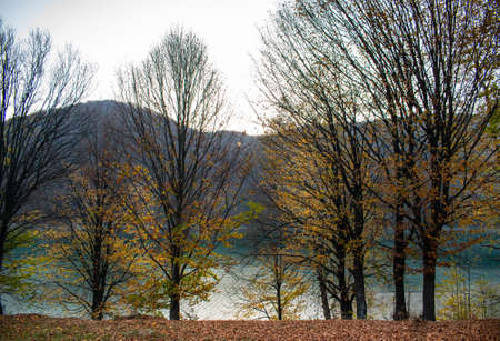 Beautiful view through the trees of a lake surrounded by forests, in a sunny day in autumn