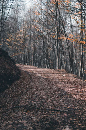 A colorful shot of path in the forest during the fall with a lot of leaves on the floor and copy space