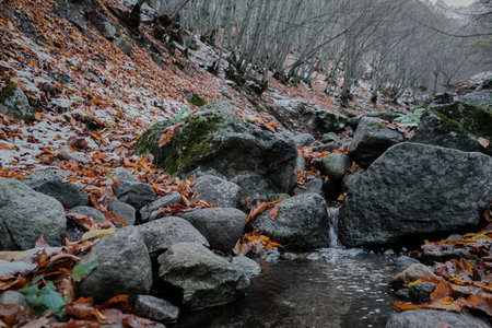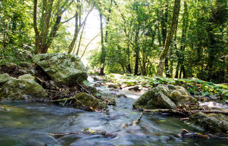 Peschiera torrent flowing in Bosco Magnano wood, in Pollino national park, a wide natural reserve in Basilicata and Calabria, italian regions