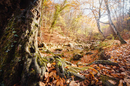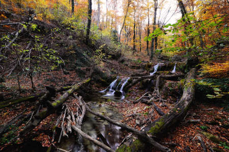 Autumn forest river creek view. Creek from the mountain waterfall in autumn forest sunset. Fall season in forest