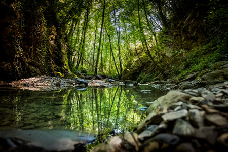 A tranquil stream flows through a dense forest, reflecting the surrounding trees and sunlight. The scene is dominated by shades of green and brown, with water creating a sense of movement. Suitable for environmental themes, it has commercial and editorial applications to illustrate nature.