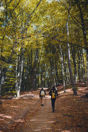 Two man friends with backpack hiking together in autumn nature. Male backpacker relax and enjoy walking on mountain trail. Healthy outdoor lifestyle holiday vacation concept.